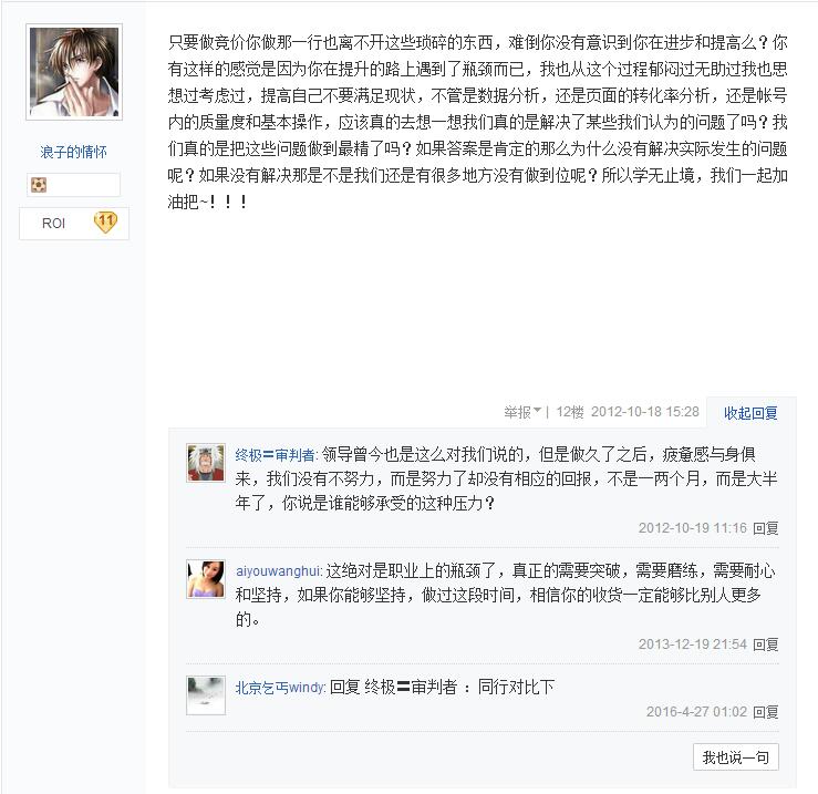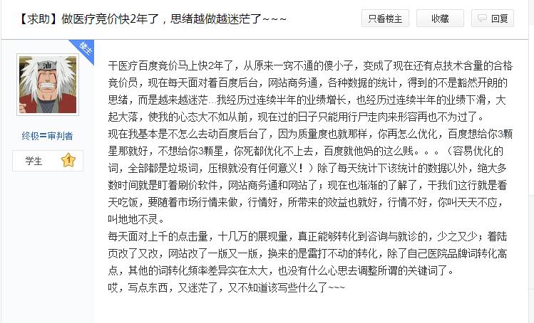 小魏看了下贴吧的互动,有人说同感,很多人仿佛找到了知音,很多人说医疗竞价现在不好做,并且感觉没前途,每天就是做数据分析,做报表,每天统计,访客分析,并且还要看百度的脸色,百度不给你的质量度,你在怎么优化,在怎么调整都没用。
